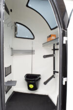 Zadelkamer toegankelijk via externe deur, voorzien van 2 uitschuifbare zadelhouders, hoofdstelhouders, opbergruimte, bezem, schep, opstapje, zitplek, spiegel en verlichting.