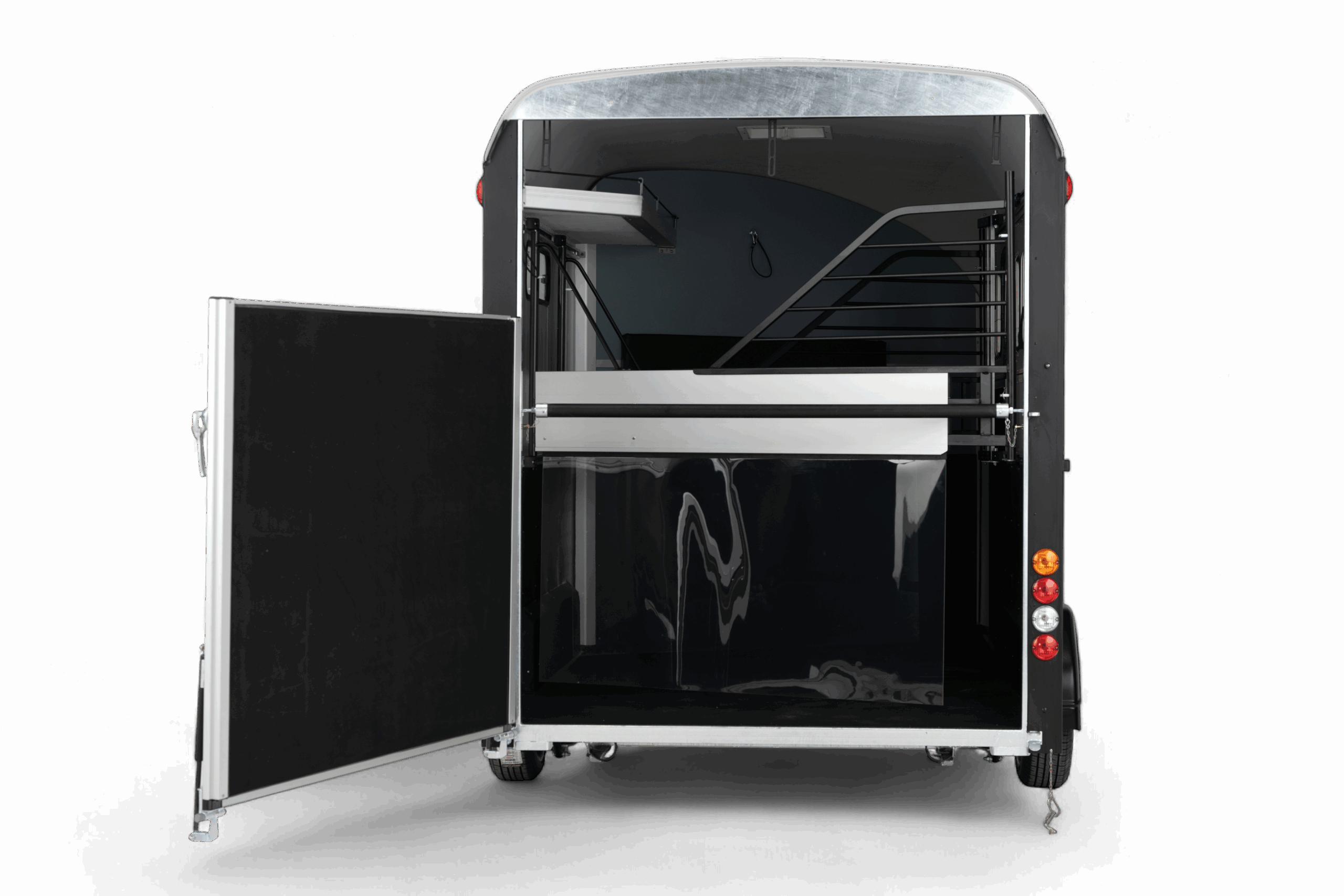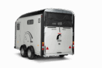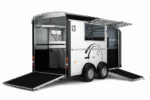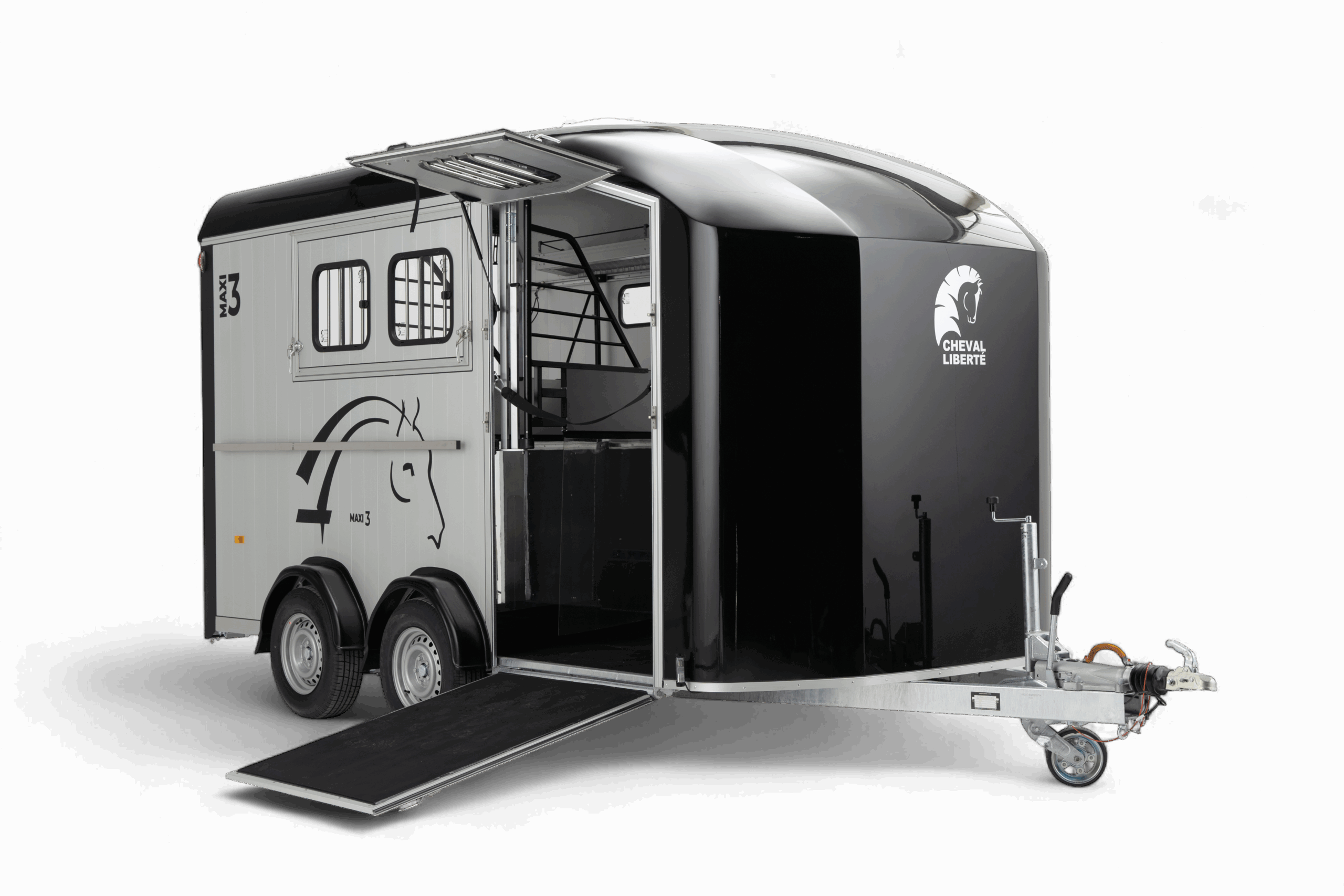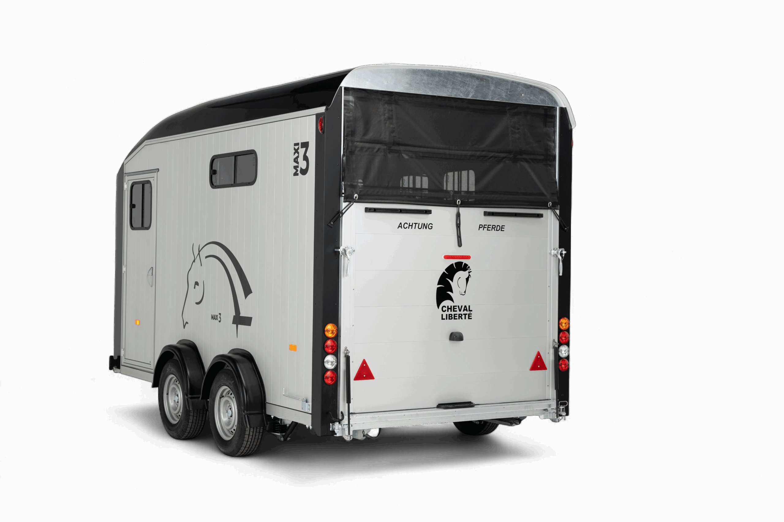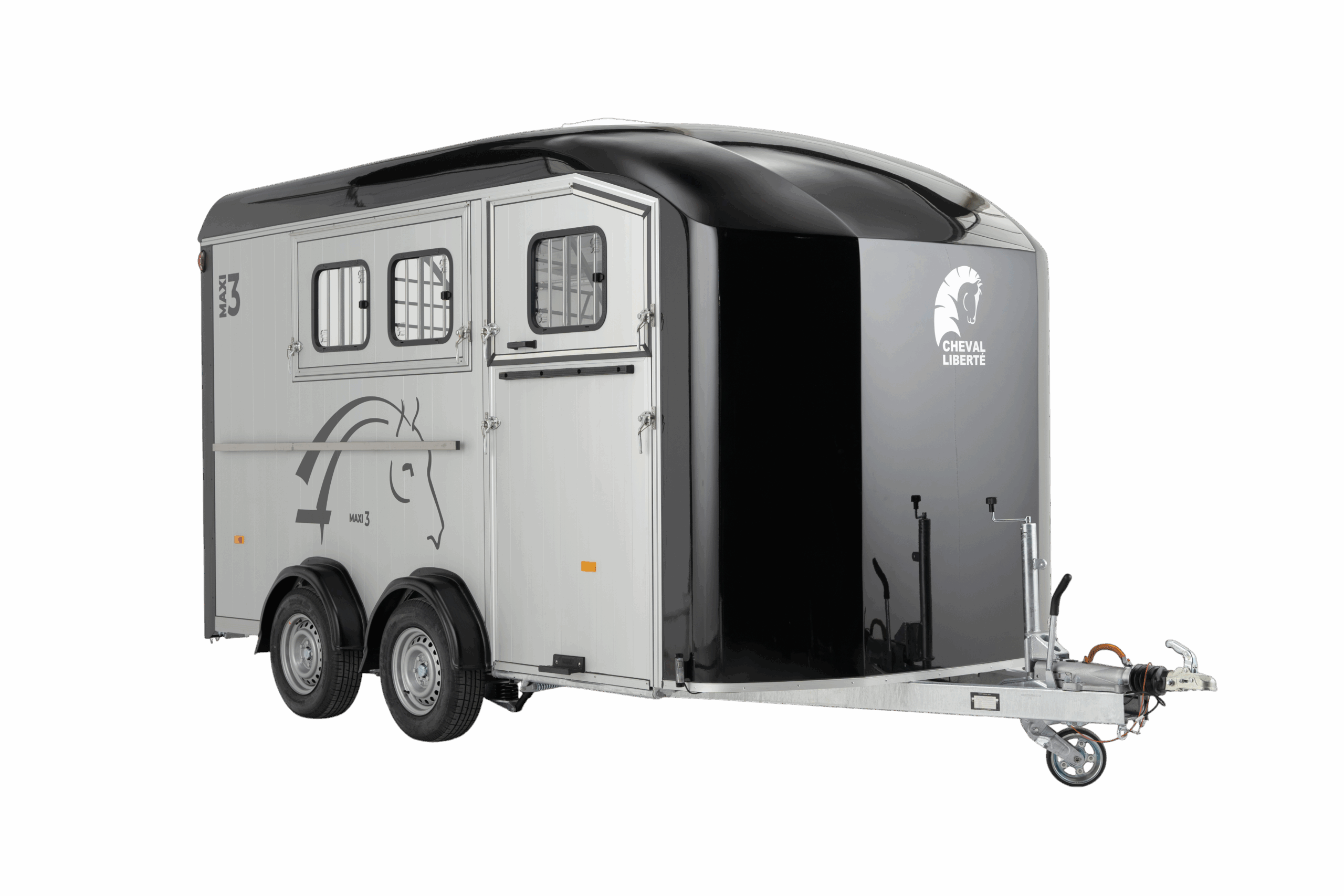 De Cheval Liberté Maxi 3 is een ruime 3-paards paardentrailer met diagonaal laad-systeem (herringbone-opstelling), speciaal ontworpen voor het comfortabel en veilig vervoeren van drie paarden. Dankzij de twee telescopisch verstelbare tussenschotten op schuifrails kunnen drie ruime paardenboxen worden gecreëerd, waarin elk paard voldoende ruimte en stabiliteit heeft. Met een laadvermogen van 2155 kg en een binnenmaat van 420 × 210 × 230 cm biedt de Maxi 3 uitzonderlijk veel ruimte voor paard én ruiter. De geanodiseerde aluminium zijwanden en het aerodynamisch gevormde polyester dak en front zorgen voor een duurzame en stijlvolle uitstraling, terwijl de aluminium vloer met antislip rubberafwerking optimale grip en eenvoudig onderhoud biedt. De trailer is voorzien van het Pullman II Performance Suspension System, dat garant staat voor maximale veiligheid, comfort en een uitstekende wegligging, ook bij volle belading. De achter- en zijlaadklep met gasveren maken het laden van paarden licht en moeiteloos, terwijl de achterklep ook als deur geopend kan worden. Binnenin is de Maxi 3 doordacht uitgerust voor comfort en veiligheid. De tussenschotten met transparante PVC-flappen zorgen voor een open en rustig gevoel, terwijl de meerdere schuiframen en dakventilatieopeningen een goed geventileerde en frisse omgeving creëren. De zadelkamer is ruim opgezet en beschikt over een grote toegangsdeur, wat het gebruiksgemak aanzienlijk verhoogt. Standaard is de trailer bovendien uitgerust met een reservewiel, zodat u altijd voorbereid de weg op gaat. Of u nu professioneel paarden vervoert of vaak deelneemt aan wedstrijden, de Cheval Liberté Maxi 3 biedt een complete, veilige en duurzame oplossing voor wie alleen het beste wil voor zijn paarden.
