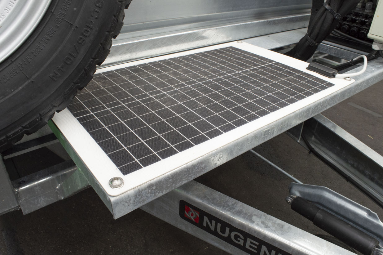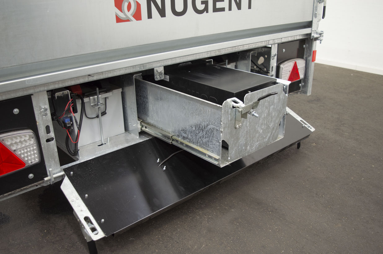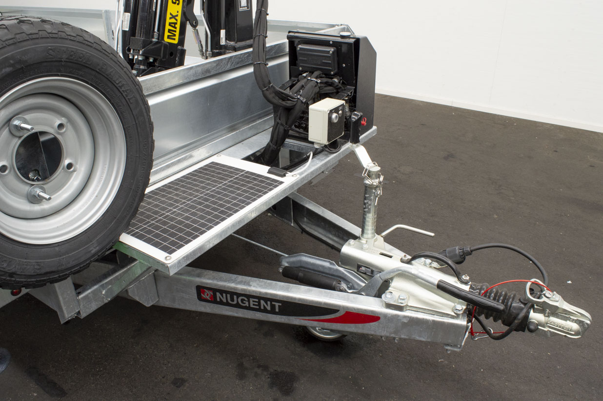 De trailer zelf is een Nugent F3720H 3,5-tons plateauwagen, voorzien van Nugent’s gepatenteerde Dual Drive™-ophanging. De kraan is volledig elektrisch, dus emissievrij en zeer stil. Nugent heeft ook een zonnepaneel voor druppelladen toegevoegd, zodat de accu tijdens het transport van de trailer wordt opgeladen.
