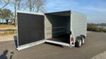 Het unieke deur/klepsysteem vergroot de multifunctionaliteit van deze gesloten aanhangwagen. De standaard achterklep bestaat uit een 18 mm dik aluminium paneel met antisliplaag en heeft een draagvermogen van 500 kg. Doordat de klep volledig horizontaal uitloopt (0°), kunnen ook voertuigen met kleinere wielen eenvoudig naar binnen rijden.