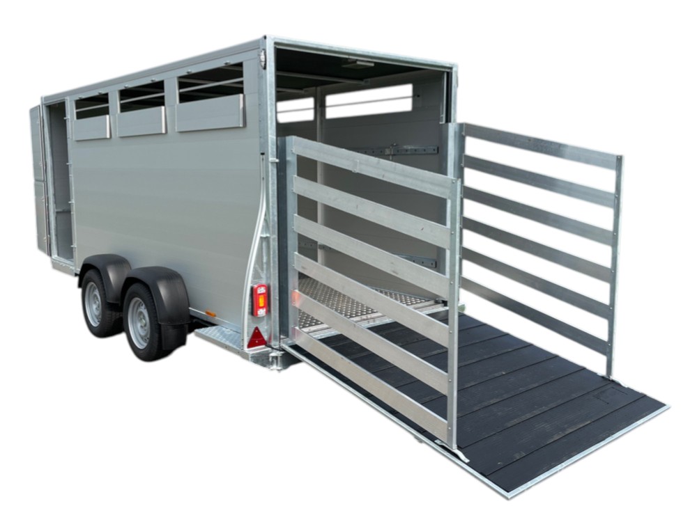 Alle facetten van optimaal diertransport zijn aanwezig. De zware kooiconstructie zorgt er voor dat uw dieren, maar ook uw veetrailer optimaal beschermd is. De achterklep is standaard voorzien van aluminium opdrijfschotten. Ook ventilatiekleppen in de zijwand zijn standaard aanwezig. De aluminium opbouw en bi-comb vloer (21 mm) gecombineerd met een aluminium tranenplaat zorgen voor een stabiel en onverslijtbaar geheel. Door de gedeelde zijdeur in een stalen kozijn kunt u uw lading nog net voor vertrek controleren. Door de deur-/klepcombinatie kunt u de trailer ook voor andere doeleinden gebruiken.